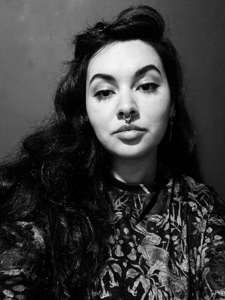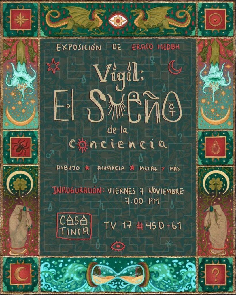 Laura Mancera Rodríguez (Erato Medbh) es una artista visual egresada de la Pontificia Universidad Javeriana con énfasis en artes gráficas. Su obra explora el vínculo entre alquimia, espiritualidad y creación de imagen, integrando dibujo, miniatura, collage y técnicas tradicionales como el gesso y el dorado. Desde una mirada simbólica y mística, aborda temas como la caída, la purificación, la memoria y la transformación del alma. Actualmente combina su práctica artística con la docencia en ilustración y su investigación sobre los procesos interiores del arte como vía de conocimiento.
