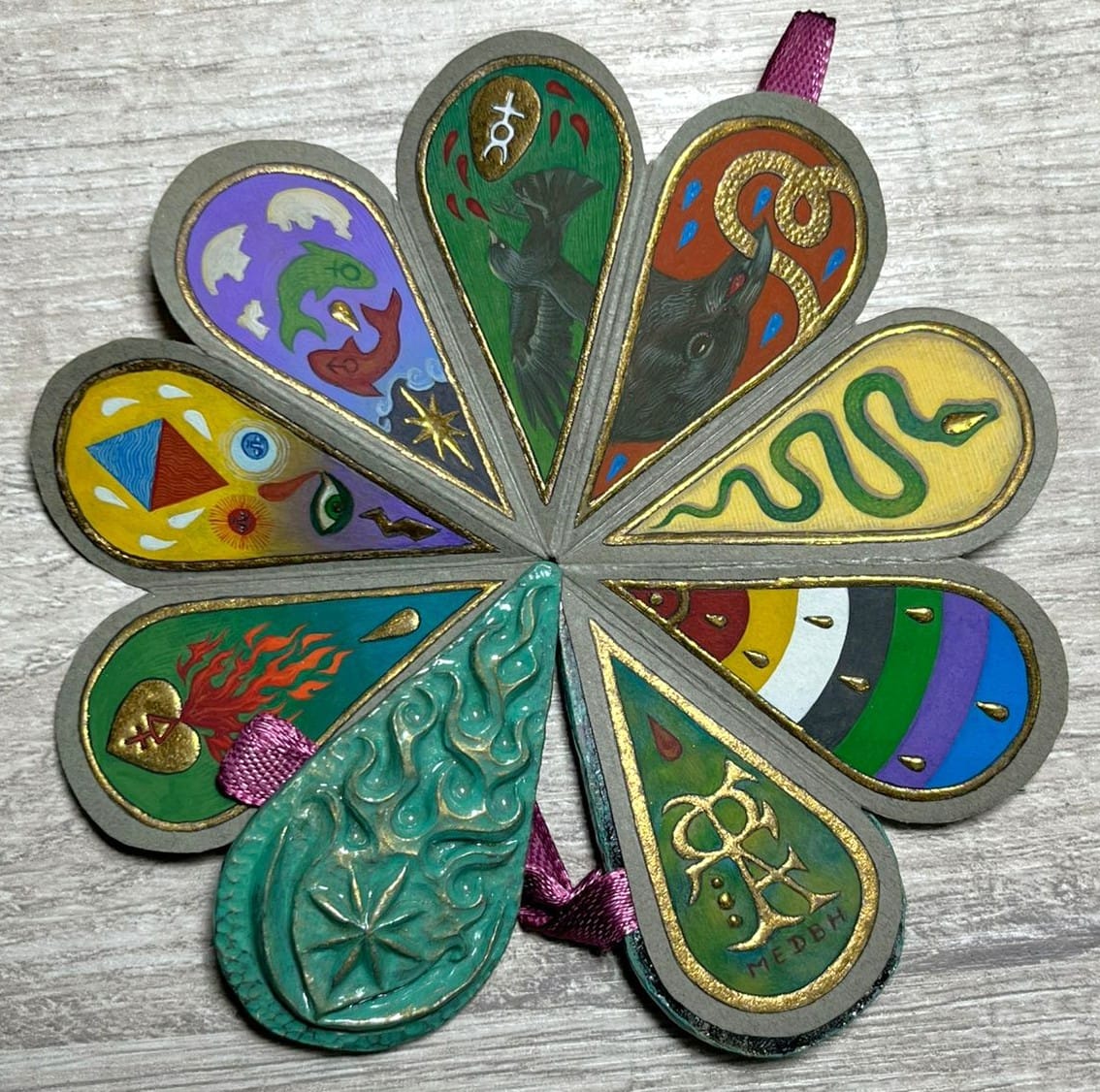 Entre símbolos alquímicos, materia y espíritu, en esta exposición Erato Medbh propone un viaje por los ciclos de la caída, el error y la búsqueda de redención. A través de miniaturas, repujados, máscaras y libros-objeto, la artista explora el deseo humano de reconciliarse con lo divino y la conciencia que persiste aun en medio del caos.
